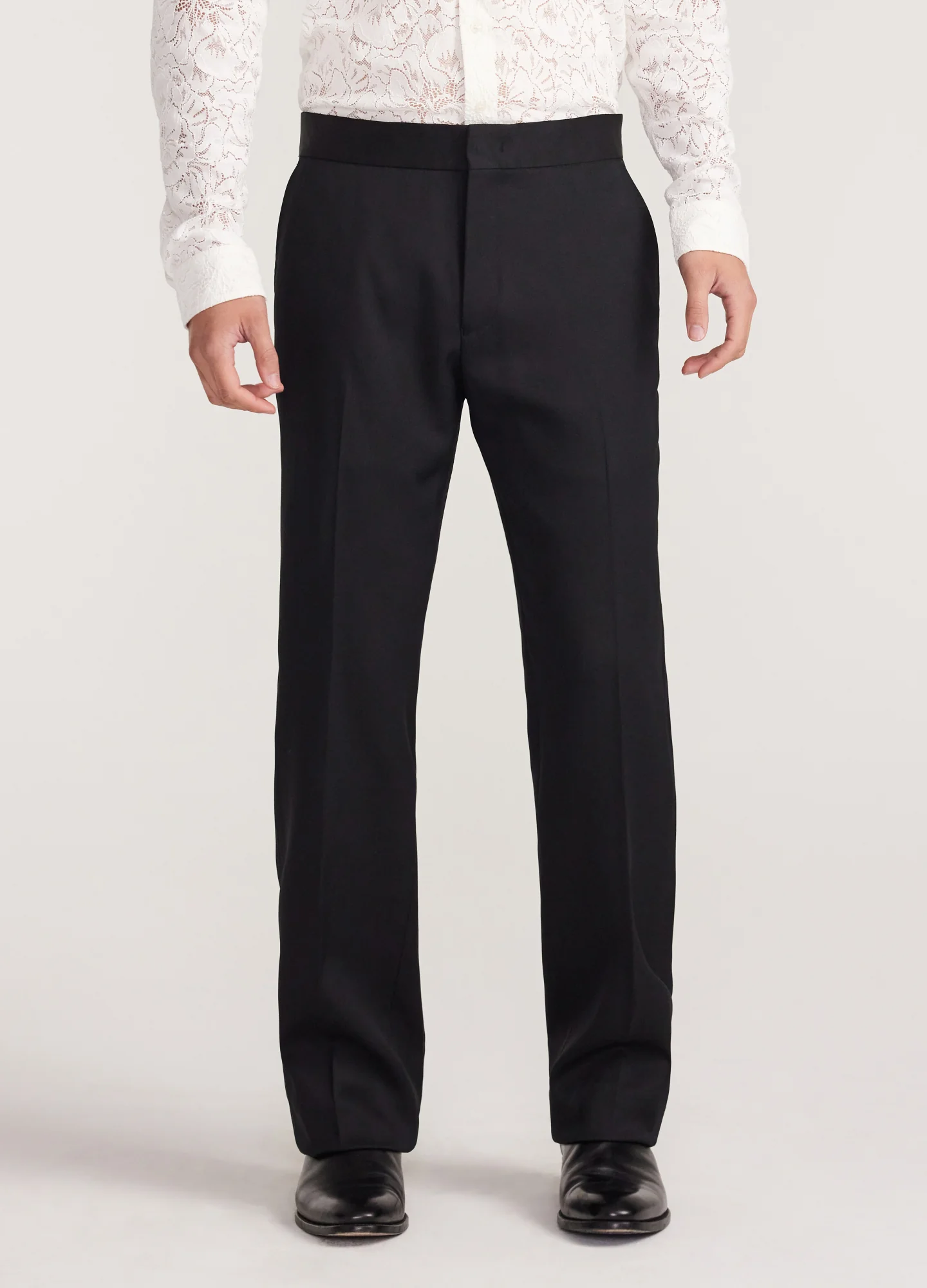 The Bootcut Evening Pants Black deliver evening wear with impact, designed to coordinate perfectly with the Lace Panel Double Breasted Jacket and Satin Lapel Waistcoat. They feature a higher waist and a wider bootcut leg shape for a flattering silhouette. Ideal for your own wedding or as the best-dressed guest.