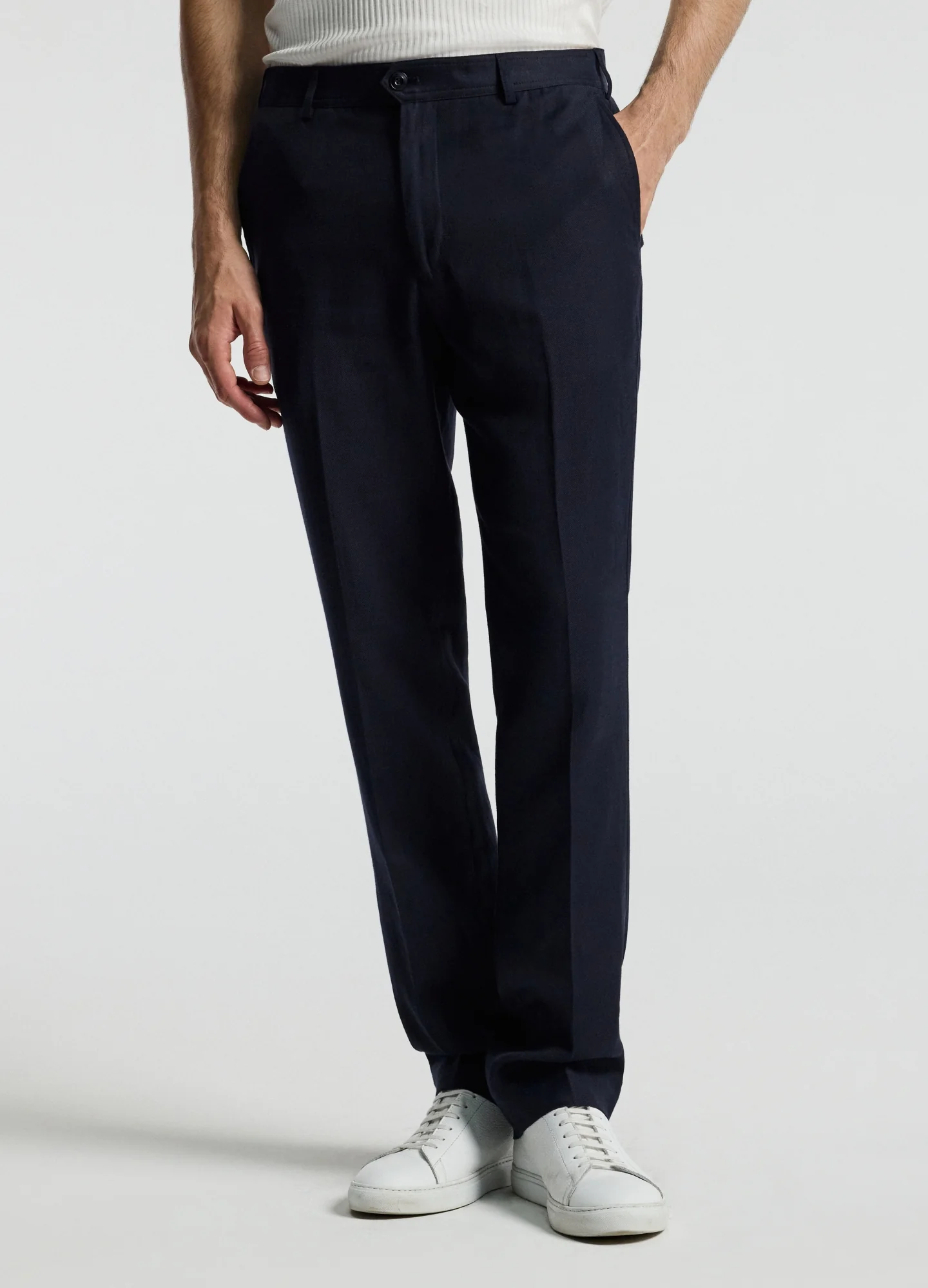 Effortless, versatile, and refined, the Linen Blend Pants in Navy are destined to be your go-to all summer long. Tailored from a textured Italian fabric that blends breathable linen, soft cotton, and fluid viscose, they balance comfort with quiet sophistication. Designed in a slim fit and finished with fine detailing, they pair perfectly with everything from tees to the coordinating shirt jacket.