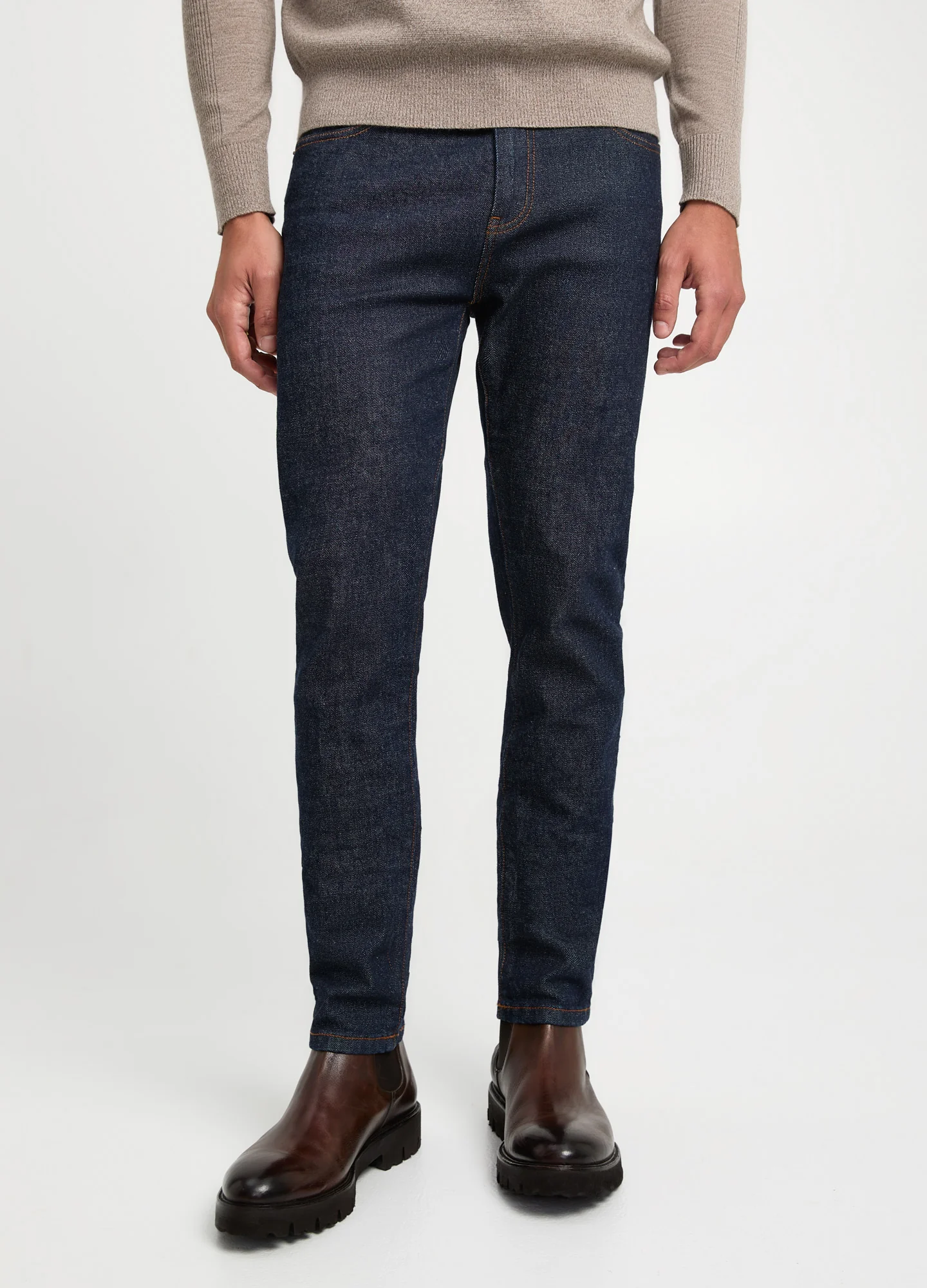 Crafted from organic and recycled European stretch cotton denim. The Skinny Fit Organic Denim Jeans feature great stretch return and a heavier weight. Rinse washed for a clean and contemporary shade. These jeans will be your work to weekend staple.