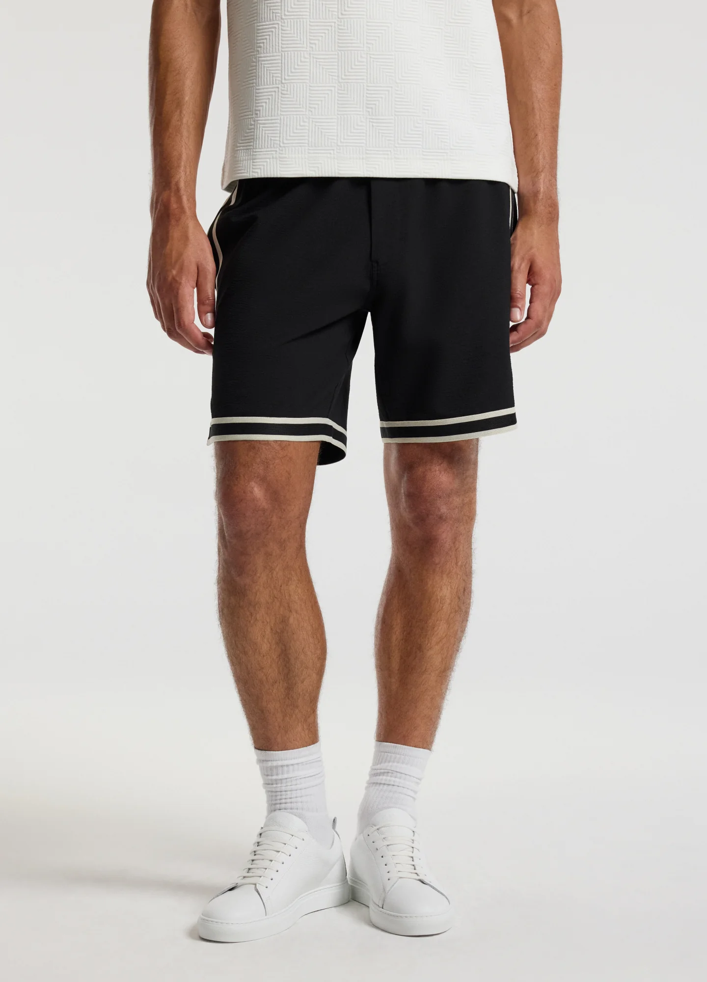 The Stripe Trim Textured Shorts deliver modern utility with a refined, technical edge. Crafted from Japanese fabric, they feature stripe tape detailing along the side seams and cuffs for subtle contrast. Designed with two inseam hip pockets and a drawcord waistband for everyday ease, they balance function with clean structure. Finished with a branded leather flag at the side seam, these shorts pair effortlessly with the matching shirt for a cohesive, contemporary look.